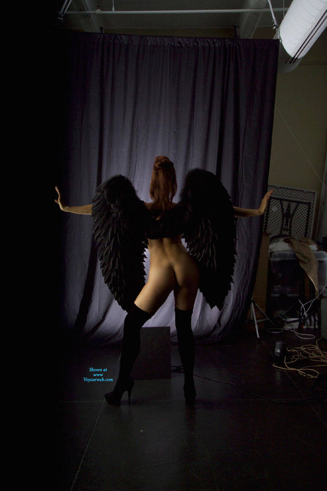 I would like to share a set of pics from a photoshoot my wife did with the same photographer as her last set.  We actually shot several times on that day.  My wife enjoyed the comments very much and gave me permission to post this set.  The photographer had these big black wings and showed them to my wife.  She loved them and knew exactly how to do her hair and makeup just for this shoot with black wings.  She won a prize last month so thank you guys for being so supportive!  If your enjoying our shoots let us know and she will keep modeling and I will keep posting:)  Enjoy