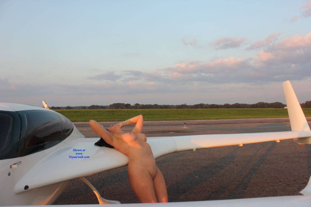• Love it, no bra, no panties, just naked in hot heels!!!! I especially love it when you lay back over the wing, your big firm enhanced tits pushing your rock hard nipples proudly skyward, as we get a great view of your perfectly smooth shaven pussy!!! :-) :-) :-)  I'm just wishing we could 'Fly United'...... ;-)